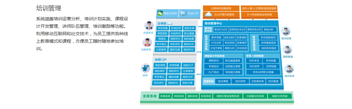支持企業(yè)人才發(fā)展戰(zhàn)略,幫助企業(yè)構(gòu)建科學(xué)、規(guī)范、全面的員工培養(yǎng)體系。系統(tǒng)涵蓋培訓(xùn)運(yùn)營分析、培訓(xùn)計(jì)劃實(shí)施、課程設(shè)計(jì)開發(fā)管理、講師隊(duì)伍管理、培訓(xùn)激勵(lì)等功能,貫穿培訓(xùn)管理全過程。系統(tǒng)充分利用移動(dòng)互聯(lián)網(wǎng)和社交技術(shù),延伸拓展培訓(xùn)空間和時(shí)間,提供各種線上教育模式和課程,方便員工隨時(shí)隨地參加培訓(xùn),及時(shí)獲得企業(yè)和崗位所要求掌握的各項(xiàng)知識(shí)和技能。